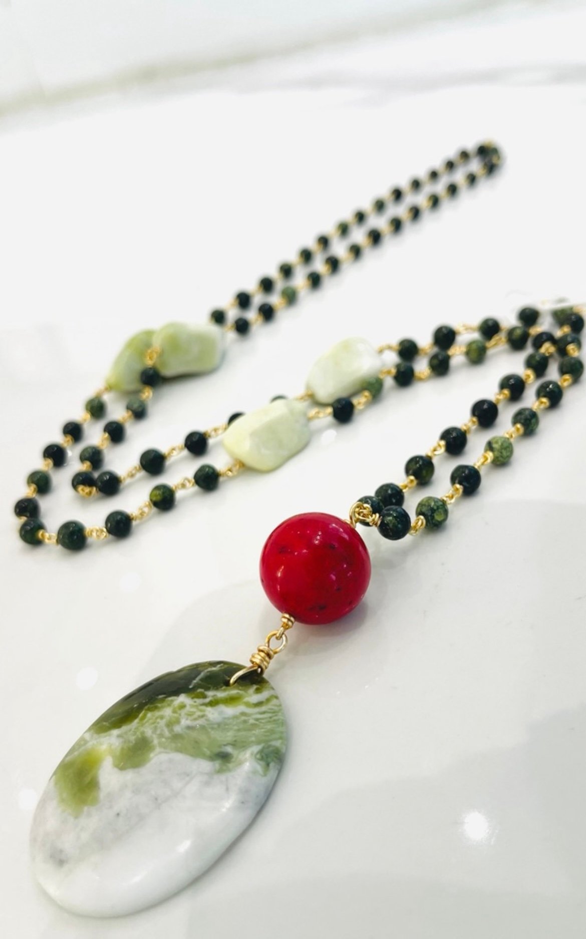 This chain necklace is made with Green Earth Jasper, New Jade, and Red Coral- each stone is different, so this piece can never be replicated exact. That means when you wear it, it’s only yours. 💚❤️