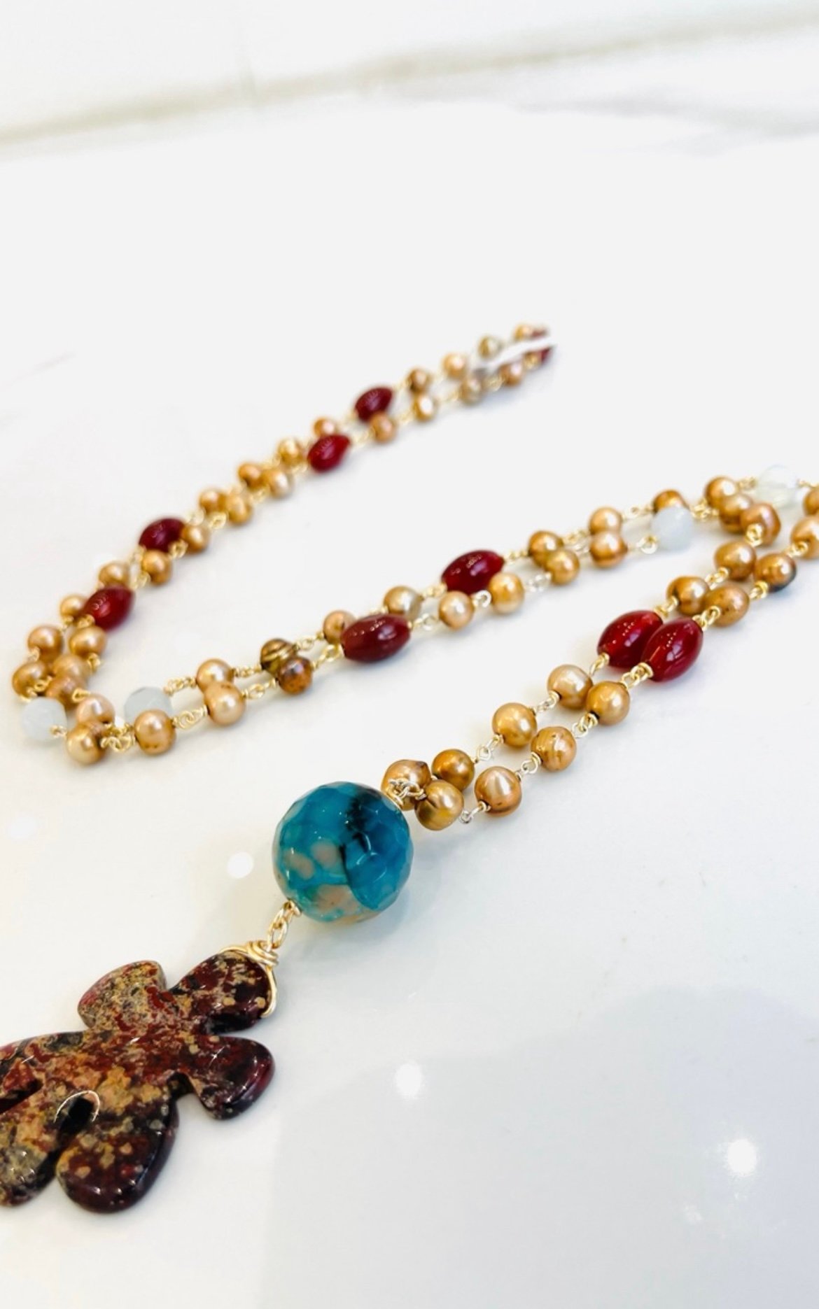 This chain necklace is made with Freshwater Pearls and Agates and Jasper- each stone is different, so this piece can never be replicated exact. That means when you wear it, it’s only yours. 🤎🤎